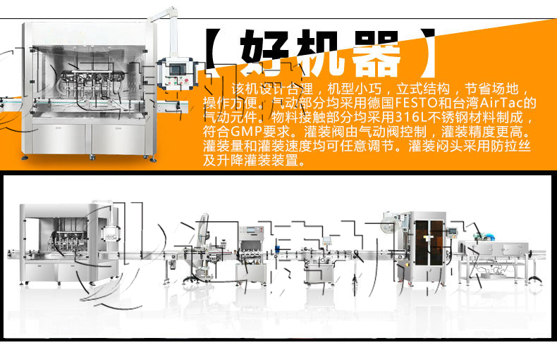 1、快速清洗、便于調整、容積缸體動作無極調速,適合不同規(guī)格、不同物料的灌裝。充填量一次調整完畢,每個容積缸體可分別微量調節(jié),灌裝精度高。接觸物料的材料為316不銹鋼、硅橡膠、符合QS規(guī)范。