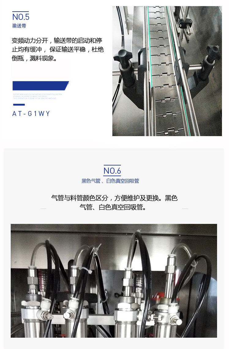 該六頭柱塞式全自動潤滑油灌裝機(jī)特的灌裝頭設(shè)計及真空回吸系統(tǒng),確保灌裝過程無殘油滴漏,快慢雙速灌裝,灌裝速度可調(diào),杜絕溢瓶現(xiàn)象。該機(jī)采用動力灌裝,無需配裝高位罐,簡化了安裝工序,提高了灌裝效率。履帶式壓蓋機(jī),穩(wěn)定無噪音,無空壓現(xiàn)象。觸摸屏界面友好,操作簡捷,SIEMENS PLC控制系統(tǒng),運算速度快,性能穩(wěn)定,品質(zhì)卓越。電、氣件均采用精品元件,確保整機(jī)運作穩(wěn)定。