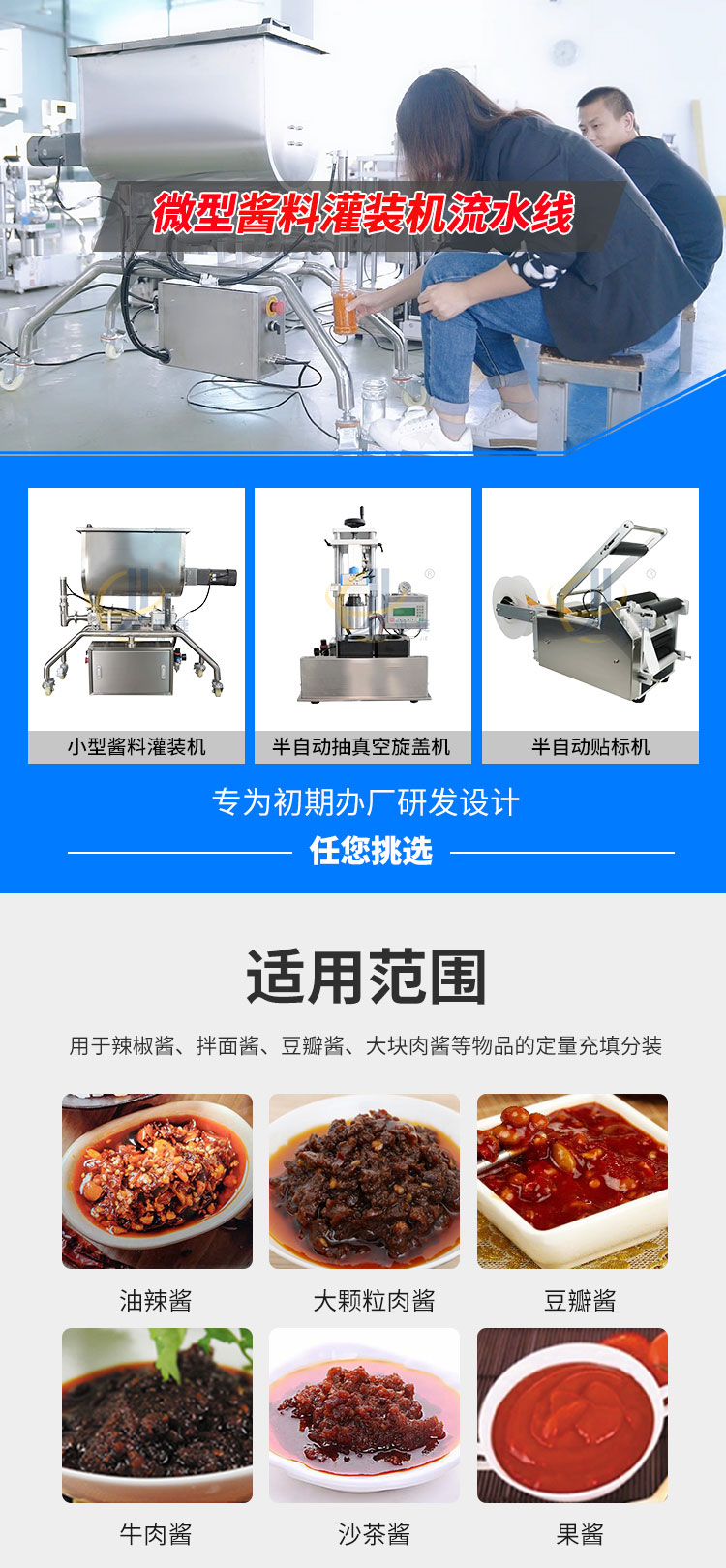 小型醬料灌裝生產(chǎn)線又名醬料灌裝三劍客,由半自動(dòng)醬料灌裝機(jī)+半自動(dòng)真空旋蓋機(jī)+半自動(dòng)圓瓶貼標(biāo)機(jī)組合而成。