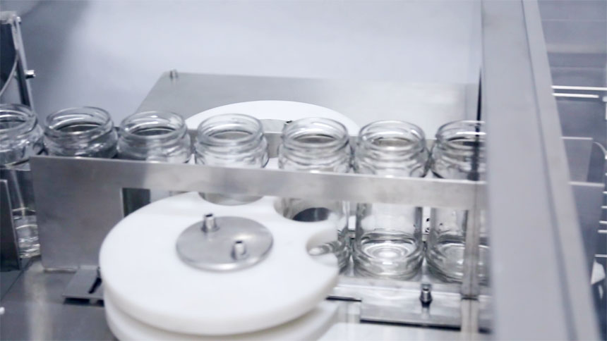設(shè)備介紹:醬類(lèi)灌裝線(xiàn)配套廣口玻璃瓶洗瓶機(jī)具有性能可靠、操作簡(jiǎn)單、清洗效果良好、工作效率高等特點(diǎn),主要由不銹鋼水泵、高壓噴頭、電器箱等組成。它的工作原理是先將需要清洗的瓶子裝進(jìn)瓶盤(pán)內(nèi),然后人工送入工位,通過(guò)循環(huán)水噴將需要清洗的瓶子注滿(mǎn)水沉至清洗槽先進(jìn)行簡(jiǎn)單的粗洗。然后瓶子會(huì)上升推進(jìn)洗瓶機(jī)的第二工位,在第二工位會(huì)進(jìn)行三次仔細(xì)的清洗,在經(jīng)過(guò)三次氣沖、甩干,再自動(dòng)進(jìn)入到滅菌烘箱。清洗過(guò)程為粗洗一次,仔細(xì)清洗三次,然后是烘干。
