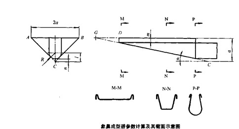 象鼻成型器的制造一般采用不銹鋼薄板,要求外表面光滑乎整。其三角部分和圓弧槽部分可用整塊板料卷曲而成,因?yàn)樗鼈兊恼归_寬度是相等的。下圖所示是象鼻成型器結(jié)構(gòu)及展開圖,沿虛線卷折即可制得成型器,圖中參數(shù)可通過計(jì)算加以選擇。