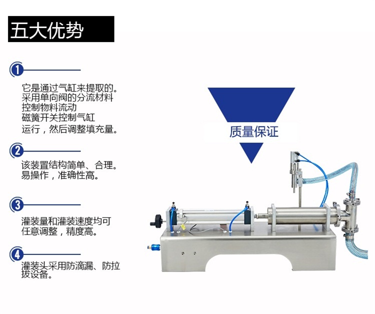 A、該設備通過氣缸帶動一個活塞來抽取和打出物料,用單向閥控制物料流向,并以磁簧開關控制氣缸的行程,即可調(diào)節(jié)灌裝量。